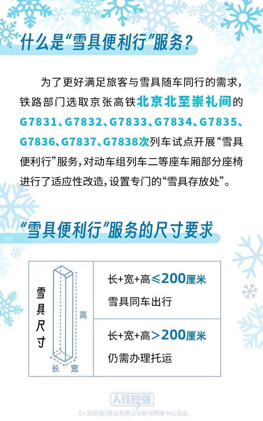 前期,铁路部门按照《国铁集团铁路旅客运输规程》“旅客乘坐动车组列车随身携带的行李物品长、宽、高之和不超过130厘米”的规定,对超过上述尺寸标准的雪具推出了“雪具快运”服务。为了更好满足旅客与雪具随车同行的需求,铁路部门统筹考虑旅客安全、乘车秩序和雪具运输需求,选取京张高铁北京北至崇礼间的G7831、G7832、G7833、G7834、G7835、G7836、G7837、G7838次列车试点开展“雪具便利行”服务,对动车组列车二等座车厢部分座椅进行了适应性改造,设置专门的“雪具存放处”,旅客选择该服务后可携带长、宽、高之和不超过200厘米的雪具同车出行,滑雪更加方便快捷。对于长、宽、高之和超过200厘米的雪具,由于高铁列车车内空间限制,仍需办理托运。