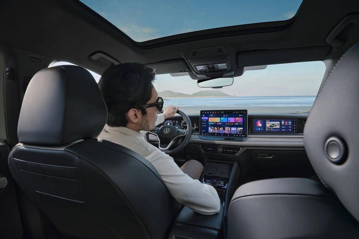 内饰方面,探岳采用了“三联屏”布局,液晶仪表盘是10.25英寸,中控屏幕是15英寸,副驾娱乐屏幕是11.6英寸,不过需要注意,低配车型并不是“三联屏”,没有配备副驾娱乐屏幕,而且IQ. Connectivity车机系统,支持卫星导航、AR实景导航、CarPlay、CarLife、双区域语音识别控制、手势控制、手机APP远程功能、车联网和OTA升级等。