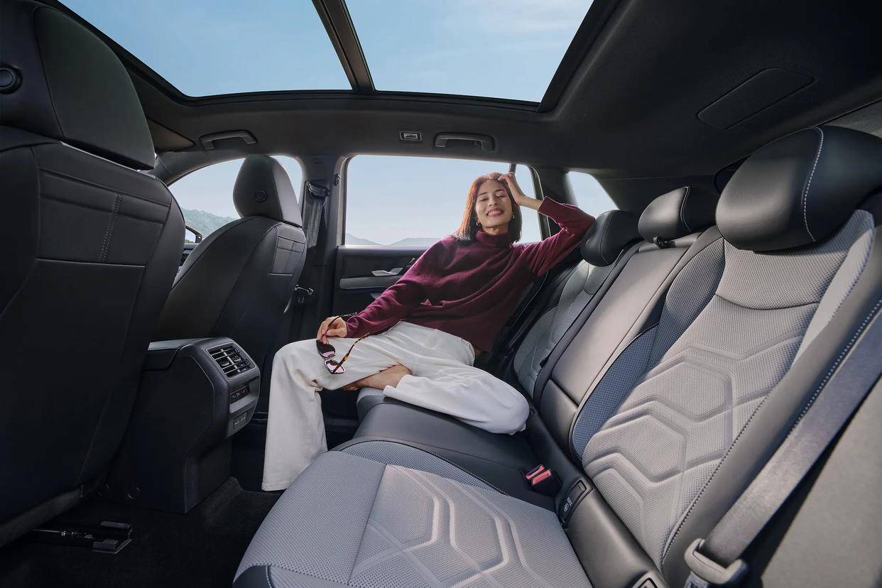 空间方面,后排腿部空间还算宽敞,而且后排座椅支持靠背调节,想要坐直一些或半躺都可以,不过座椅内部填充偏硬,而且坐垫较短,影响乘坐舒适性。还有一点需要注意,该车的后排地台隆起较高,影响后排中间乘客的腿部姿态。